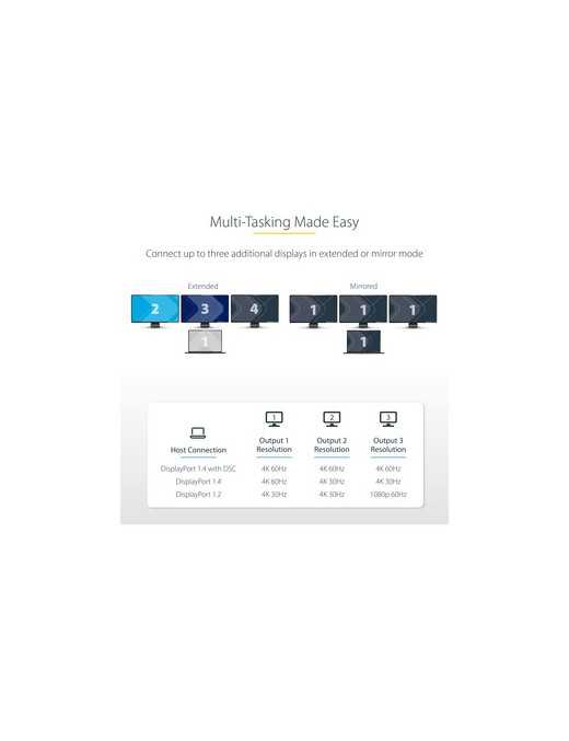 Host Connection Output 1 Resolution Output 2 Resolution Output 3 Resolution DisplayPort 1.4 with DSC 4K 60Hz 4K 60Hz 4K 60Hz DisplayPort 1.4 4K 60Hz 4K 30Hz 4K 30Hz DisplayPort 1.2 4K 30Hz 4K 30Hz 1080p 60Hz4K at 60Hz and HDR