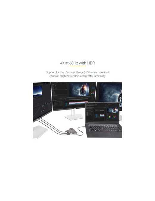 Multi-Stream Transport (MST) technology combines multiple video signals into a single output signal/stream. This MST Hub separates the single input stream into three independent signals, one for each DisplayPort enabled display. Support for High Dynamic Range (HDR) offers increased contrast, brightness, colors, and greater luminosity.