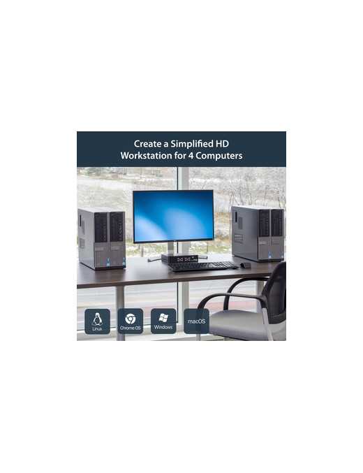 A simple yet comprehensive solution, the 4-port KVM features both front-panel push-button and hotkey switching, and offers a small form factor with rear connection ports, to minimize workspace disruptions.