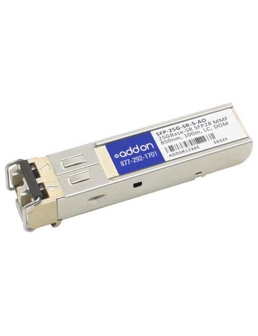 This Cisco® SFP-25G-SR-S compatible SFP28 transceiver provides 25GBase-SR throughput up to 100m over multi-mode fiber (MMF) at a wavelength of 850nm using a LC connector. It is guaranteed to be 100% compatible with the equivalent Cisco® transceiver. This easy to install, hot swappable transceiver has been programmed, uniquely serialized and data-traffic and application tested to ensure that it will initialize and perform identically. Digital optical monitoring (DOM) support is also present to allow access to real-time operating parameters. This transceiver is Trade Agreements Act (TAA) compliant. We stand behind the quality of our products and proudly offer a limited lifetime warranty.