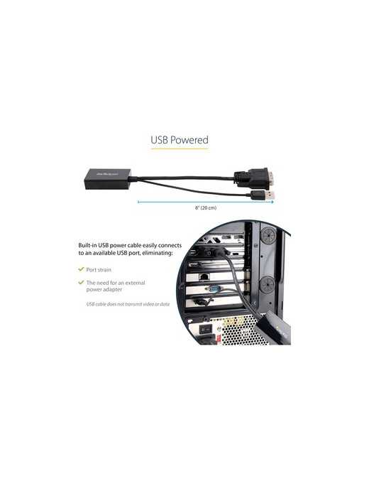 The DVI to DisplayPort converter is USB powered, giving you the freedom to power itusing a USB port on your computer, unlike some converters that require bulky external power adapters. USB powered devicesdon't require an AC outlet, so you can connect a DVI computer to a DP projector or display where power outlets are limited or inaccessible, such as yourboardroom or workstation.