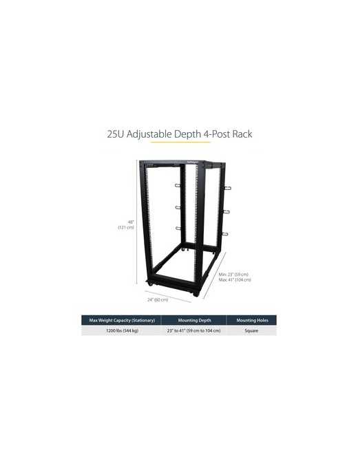 The 4POSTRACK25U 25U Server Rack lets you store your servers, network and telecommunications equipment in a sturdy, adjustable depth open-frame rack.