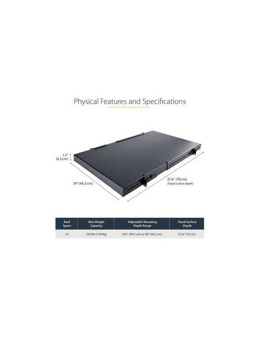 StarTech.com 1U Adjustable Mounting Depth Rack Mount Shelf - Heavy Duty Fixed Rack Shelf - 175lbs / 80kg - Add a high capacity,